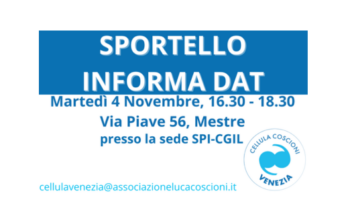 Sportello Informa DAT a Mestre – Compila gratuitamente il tuo testamento biologico 📍 Mestre (VE) – Via Piave 56, sede SPI-CGIL🗓️ Martedì 4 novembre 2025🕟 Dalle 16:30 alle 18:30 La Cellula Coscioni di...