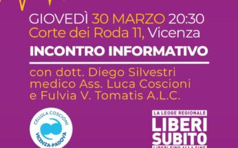 La Cellula Coscioni Vicenza-Padova organizza un incontro informativo su DAT e PDL Regionale LIBERI SUBITO. L’appuntamento è per giovedì 30 marzo alle ore 20.30 presso Corte dei Roda 11, a... Leggi tutto