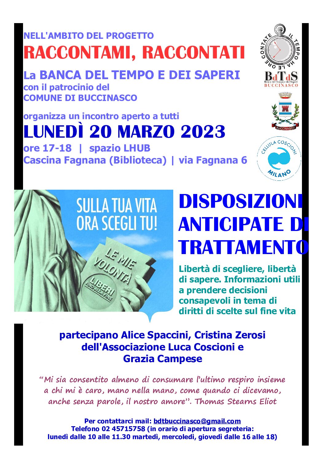 La Cellula Coscioni Milano sarà ospite del progetto Raccontami, Raccontati la banca del tempo e dei saperi, per un incontro dal titolo DAT – libertà di scegliere, libertà di sapere.... Leggi tutto