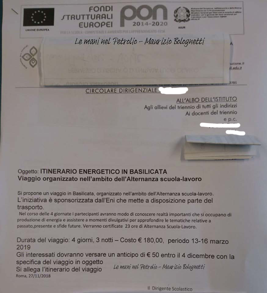 All’albo pretorio di tutte le scuole d’Italia è stata affissa una circolare, con tanto di logo del MIUR (Ministero della Pubblica Istruzione), nella quale si propone un viaggio in lucania (organizzato nell’ambito dell’alternanza scuola-lavoro) sponsorizzato da Eni, che, bontà sua, si accollerà parte delle spese di trasporto.