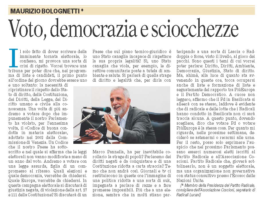 Maurizio Bolognetti, giornalista, collaboratore di Radio Radicale, per la quale ha tra l’altro realizzato numerosi reportage su vicende di inquinamento ambientale, autore dei libri “Buchi per terra ovvero cinquanta sfumature di greggio”, “Le mani nel petrolio ovvero da Zanardelli a Papaleo passando per Sanremo e Tempa Rossa” e “La peste Italiana. Il Caso Basilicata”. Bolognetti ha collaborato con “Agenda Coscioni” e il settimanale “Il Resto”. Ha costituito nel 2004 l’Associazione Radicali Lucani di cui è Segretario.