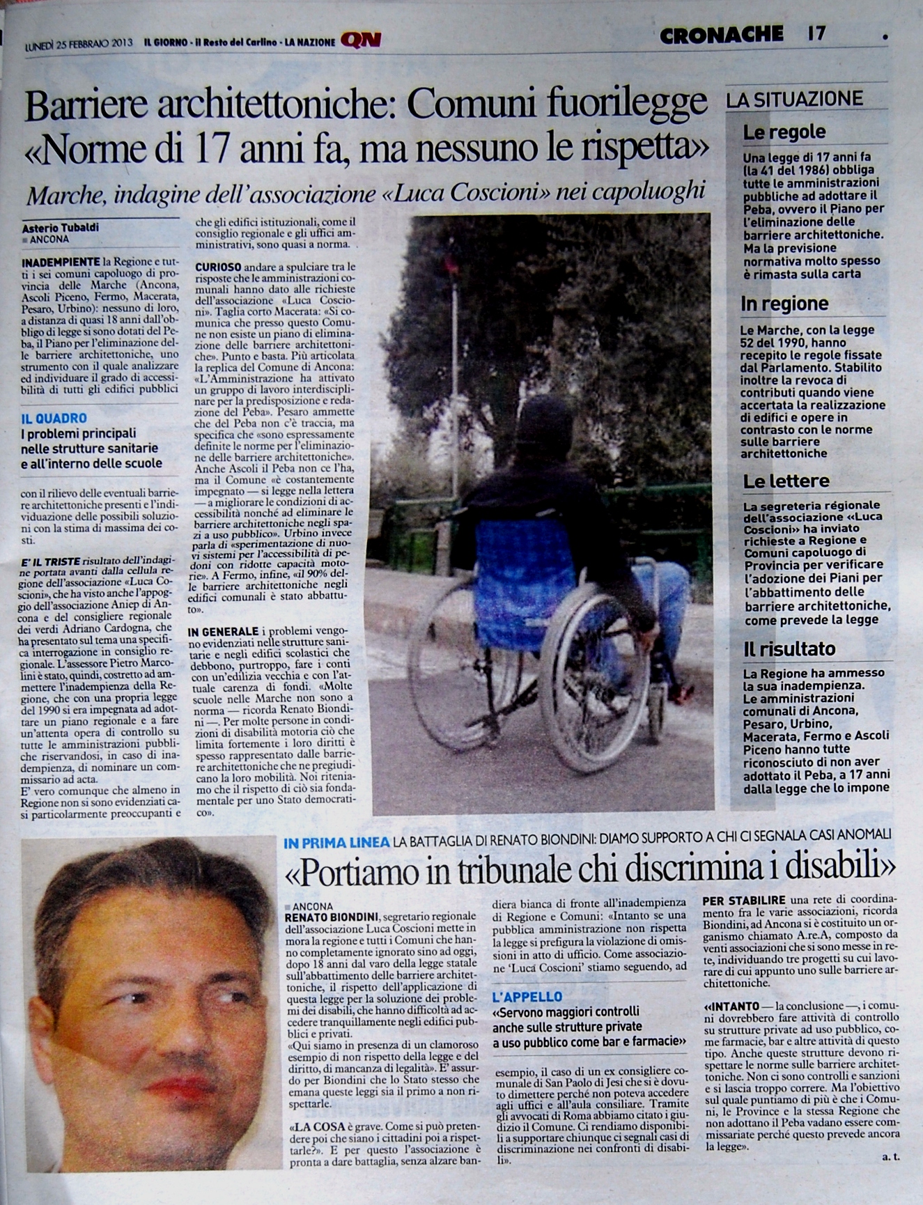 Per verificare se i sei comuni capoluogo di provincia delle Marche (Urbino, Pesaro, Macerata, Fermo e Ascoli Piceno e Ancona) hanno adottato il PEBA, il 23 settembre 2012 è stata inviata a questi sei comuni una lettera per richiedere l’accesso agli atti (così come previsto dalla legge 241/90) per sapere se era stato adottato il PEBA ed eventualmente visionarlo. Ebbene tutti i sei comuni capoluogo di provincia, alcuni con molto ritardo violando le prescrizioni della legge 241/1990 sulla trasparenza amministrativa e solo dopo diversi solleciti inviati tramite l’ufficio del difensore civico regionale, hanno risposto dichiarato la loro totale inadempienza in tema di adozione dei PEBA.