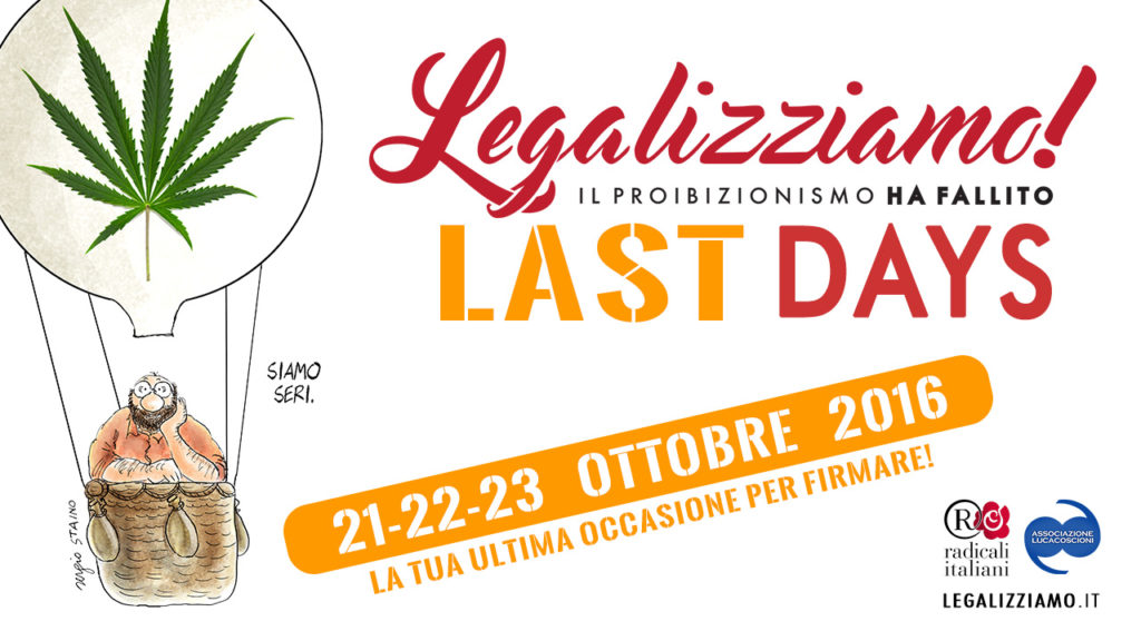 L’obiettivo è raccogliere le ultime firme necessarie sulla legge di iniziativa popolare per la legalizzazione della cannabis e la decriminalizzazione dell’uso personale di tutte le sostanze, promossa da Radicali Italiani e Associazione Coscioni in collaborazione con Possibile, A Buon Diritto, Coalizione Italiana per le Libertà Civili e Democratiche, Forum Droghe, Antigone, La PianTiamo, Società della Ragione e di decine di grow shop/canapai italiani.