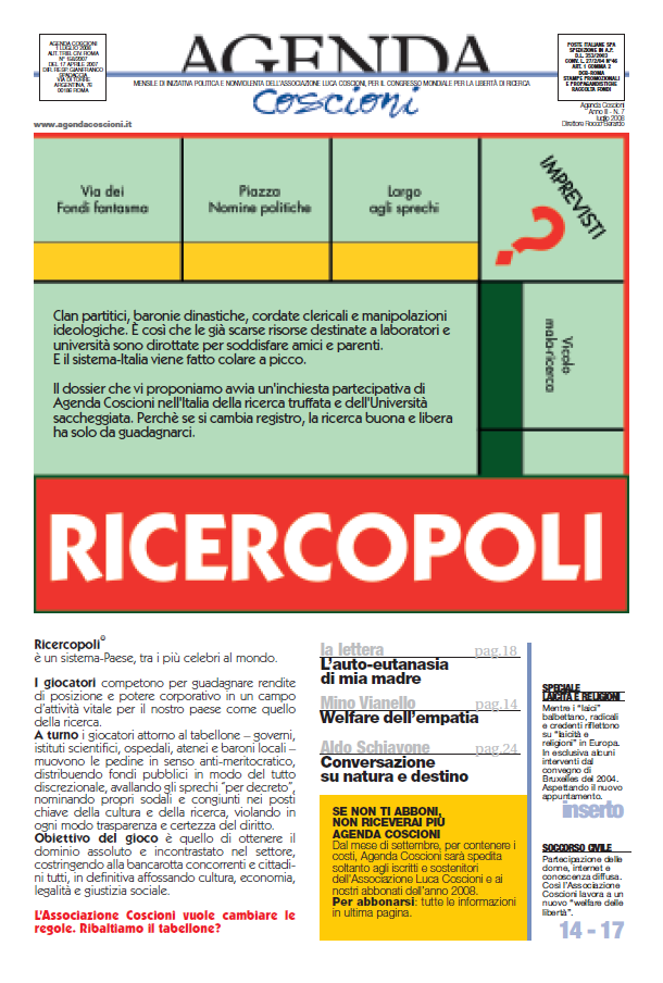 “Ricercopoli”, così si chiama l’inchiesta partecipativa lanciata dall’Associazione Luca Coscioni tramite il suo mensile Agenda Coscioni ed il sito internet della stessa associazione. Obiettivo è quello di coinvolgere i cittadini in una “grande inchiesta partecipativa” sul mondo della ricerca in Italia. “Un’inchiesta partecipativa nell’Italia della ricerca truffata e dell’università saccheggiata”, si legge sulla prima pagina del mensile che sarà in edicola in alcune città e distribuito via posta in tutta Italia, come pure nelle caselle di deputati e senatori della Repubblica.