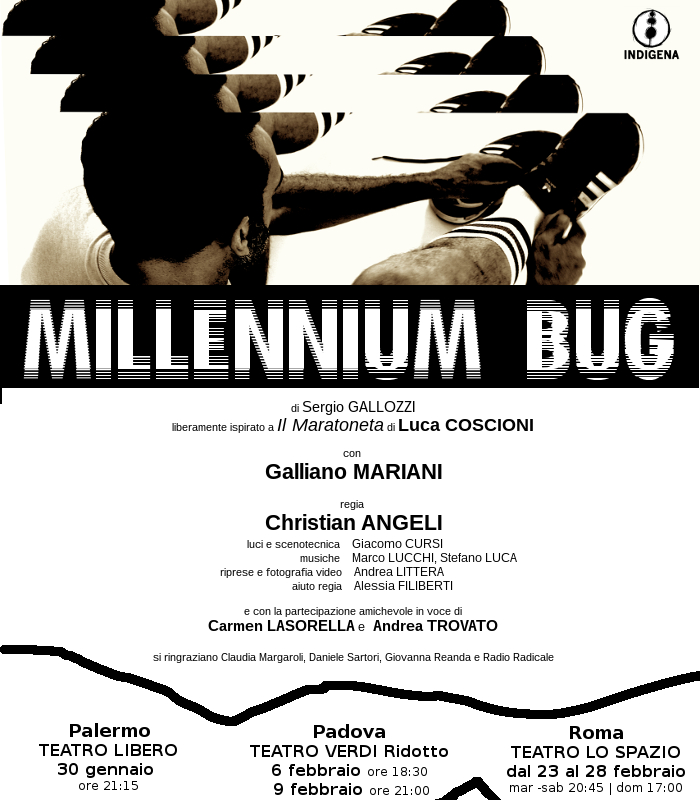 A dieci anni dalla scomparsa di Luca Coscioni, leader radicale, l’Associazione Luca Coscioni per la libertà di ricerca scientifica da lui fondata promuove l’ultima produzione di Indigena, Millennium Bug: un monologo teatrale inedito di Sergio Gallozzi liberamente ispirato al libro-diario “Il Maratoneta” di Luca Coscioni (ed. Stampa Alternativa, 2003). Secondo la descrizione dell’ autore “ Lo spettacolo scandaglia le possibilità interiori di ogni individuo che sono preludio necessario all’azione politica ed incita il pubblico a riattivare l’attenzione sui temi cosiddetti “etici”, tanto fondamentali nella vita delle persone quanto costantemente rinviati dall’agenda pubblica. La regia di Christian Angeli non chiede all’interprete Galliano Mariani di impersonare Luca Coscioni, ma di dare corpo al suo pensiero e forma alle sue lotte in posizione dialogica con gli interventi della popolare giornalista Carmen Lasorella“.