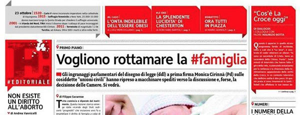 L’Italia, per fare solo alcuni esempi, non ha né il testamento biologico né le unioni civili, né il divorzio breve né una politica di sostegno ai disabili; non riesce nemmeno a discutere di eutanasia; vede quotidianamente messa in discussione la possibilità di abortire a causa del numero smisurato di obiettori di coscienza; non fa nulla di sostanziale per superare la vergogna della sue carceri: in altre parole, si pone in Europa come “il paese dei diritti negati”. In un paese così tutto serve tranne un nuovo quotidiano che fin dal nome – “LA CROCE, quotidiano contro i falsi miti di progresso” – la dice lunga sul programma editoriale. Si potrebbe anche non enfatizzare l’arrivo in edicola di un quotidiano che si presenta come organo della associazione “Voglio la mamma”, il che farebbe pensare ad uno scherzo del compianto settimanale satirico “Il Male”. Ma il problema è che LACROCE va ad aggiungersi a “E’vita”, supplemento settimanale di “Avvenire”, sfacciatamente di parte ma ricco di notizie, al “Foglio”, con le sue campagne barricadere ma anche con molte notizie da ogni parte del mondo, agli editoriali dello “Osservatore Romano”, alla corazzata “Famiglia Cristiana”. Invece nessuno dei grandi quotidiani di opinione e dei giornali “di sinistra” – che pure dedicano supplementi ai temi più svariati, dai “tempi liberi” alla salute, dai libri alla cucina – ha un supplemento o un inserto sui temi bioetici e sui diritti civili né dedica loro una costante attenzione. Chi è in grado di parlarne con i loro direttori? Per favore, lo faccia.