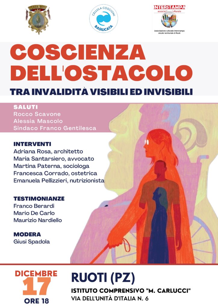 la Cellula Coscioni Basilicata, insieme all’Associazione Culturale Interstampa e con il patrocinio del Comune di Ruoti, organizzano un convegno sul tema della disabilità dal titolo “Coscienza dell’ostacolo, tra invalidità visibili ed invisibili.