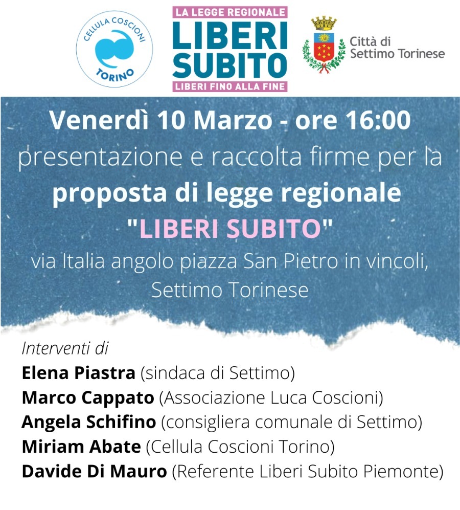 Interverranno anche Elena Piastra, sindaca di Settimo Torinese, Angela Schifino, consigliera comunale, e Miriam Abate e Davide di Mauro, entrambi della Cellula Coscioni Torino.