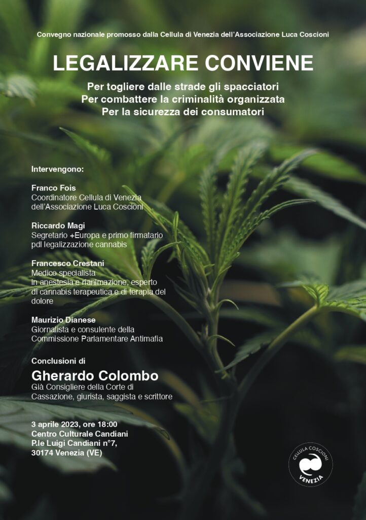 La Cellula Coscioni Venezia organizza il convegno “Legalizzare conviene”, con Riccardo Magi