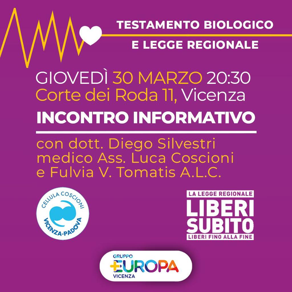 La Cellula Coscioni Vicenza-Padova organizza un incontro informativo su DAT e PDL Regionale LIBERI SUBITO.