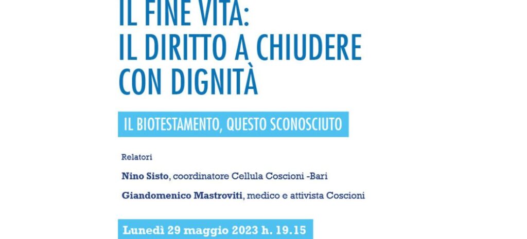 La Cellula Coscioni di Bari organizza un’iniziativa informativa sul testamento biologico dal titolo: Il fine vita: il diritto a chiudere con dignità.