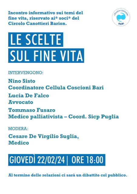 La Cellula Coscioni Bari organizza un’iniziativa divulgativa sulle scelte del fine vita.