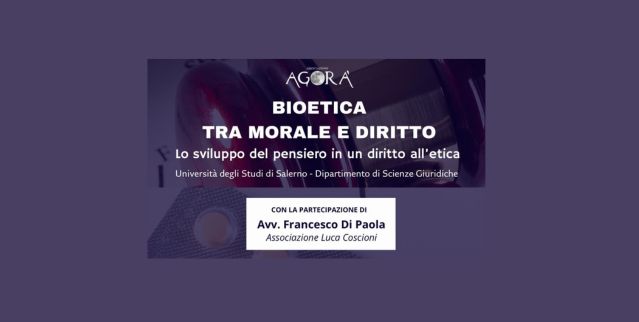 L’avvocato Francesco di Paola, membro di Giunta di Associazione Luca Coscioni per la libertà di ricerca scientifica APS, interverrà come relatore al convegno “Bioetica tra morale e diritto – Lo sviluppo al pensiero in un diritto all’etica”, organizzato dal dipartimento di Scienze Giuridiche dell’Università di Salerno.