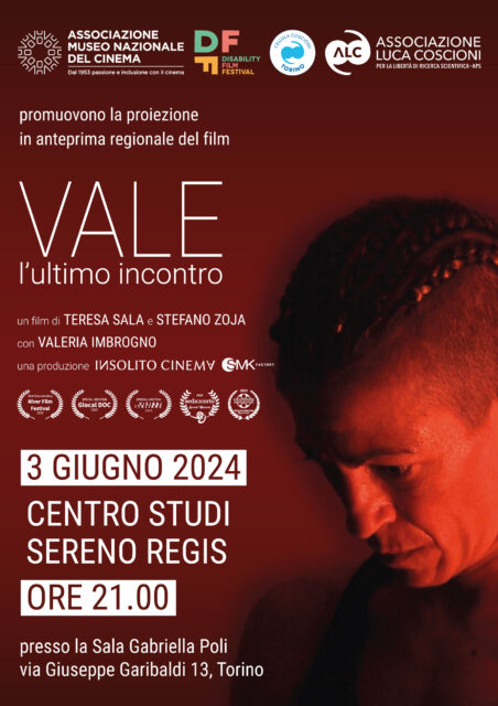 L’Associazione Museo Nazionale del Cinema promuove, in collaborazione con l’Associazione Luca Coscioni , la Cellula Coscioni di Torino e il Disability Film Festival (DFF);  la proiezione in anteprima regionale del film Vale – L’ultimo incontro di Teresa Sala e Stefano Zoja.