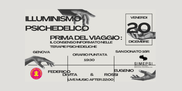 La Cellula Coscioni di Genova sarà presente per l’ultima puntata dal vivo dell’anno di Illuminismo Psichedelico. Interverrà lo specializzando in psichiatria Eugenio Rossi, (segretario di SIMEPSI). Si parlerà del consenso informato nelle terapie psichedeliche. Seguirà un dj set.