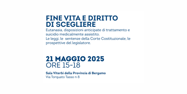 Il 21 maggio 2025, dalle 15:00 alle 18:00, presso la Sala Viterbi del Palazzo della Provincia di Bergamo (via Torquato Tasso 8), si terrà il convegno “Fine vita e diritto di scegliere”, dedicato a eutanasia, disposizioni anticipate di trattamento e suicidio medicalmente assistito, con un approfondimento sul quadro giuridico e costituzionale attuale.