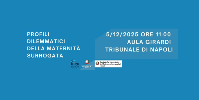 Venerdì 5 dicembre, presso l’Aula Girardi del Tribunale di Napoli, si terrà il convegno “Profili dilemmatici della maternità surrogata”, promosso da AIGA Napoli, dal Consiglio dell’Ordine degli Avvocati di Napoli e dal Comitato Pari Opportunità COA Napoli.