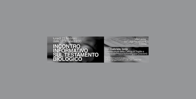 Gabriele Isola, coordinatore della Cellula Coscioni di Trieste, sarà protagonista dell’incontro informativo dedicato al testamento biologico (Disposizioni Anticipate di Trattamento – DAT) organizzato da Vita Lenta.