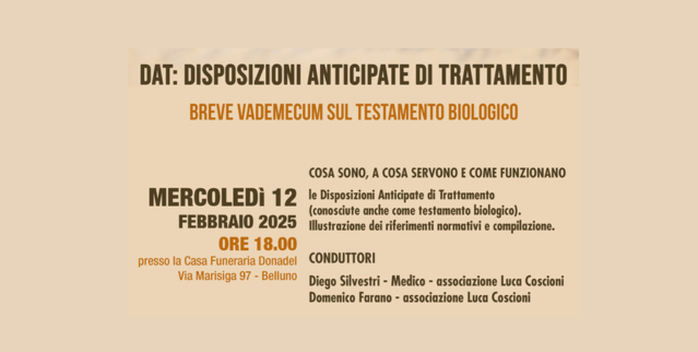 L’appuntamento è per mercoledì 12 febbraio alle ore 18.00, presso la Casa Funeraria Donadel, in Via Marisiga 97, a Belluno (BL).