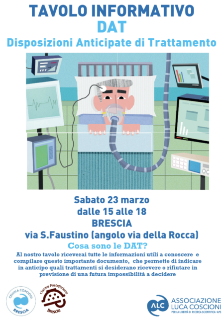 La Cellula Coscioni di Brescia insieme alla Ciurma Pastafariana di Brescia organizzano un tavolo informativo sulle DAT.