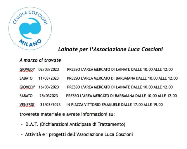 A marzo i volontari Coscioni organizzano una serie di banchetti informativi su DAT e iniziative dell’associazione: