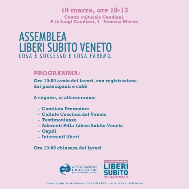 L’incontro è aperto a tutti i sottoscrittori della PDL Liberi Subito Veneto e alla cittadinanza.