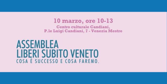A Mestre, Il comitato promotore Liberi Subito Veneto organizza l’Assemblea Liberi Subito Veneto – Cosa è successo e cosa faremo, per discutere delle prossime mosse per il rilancio dell’iniziativa politica.