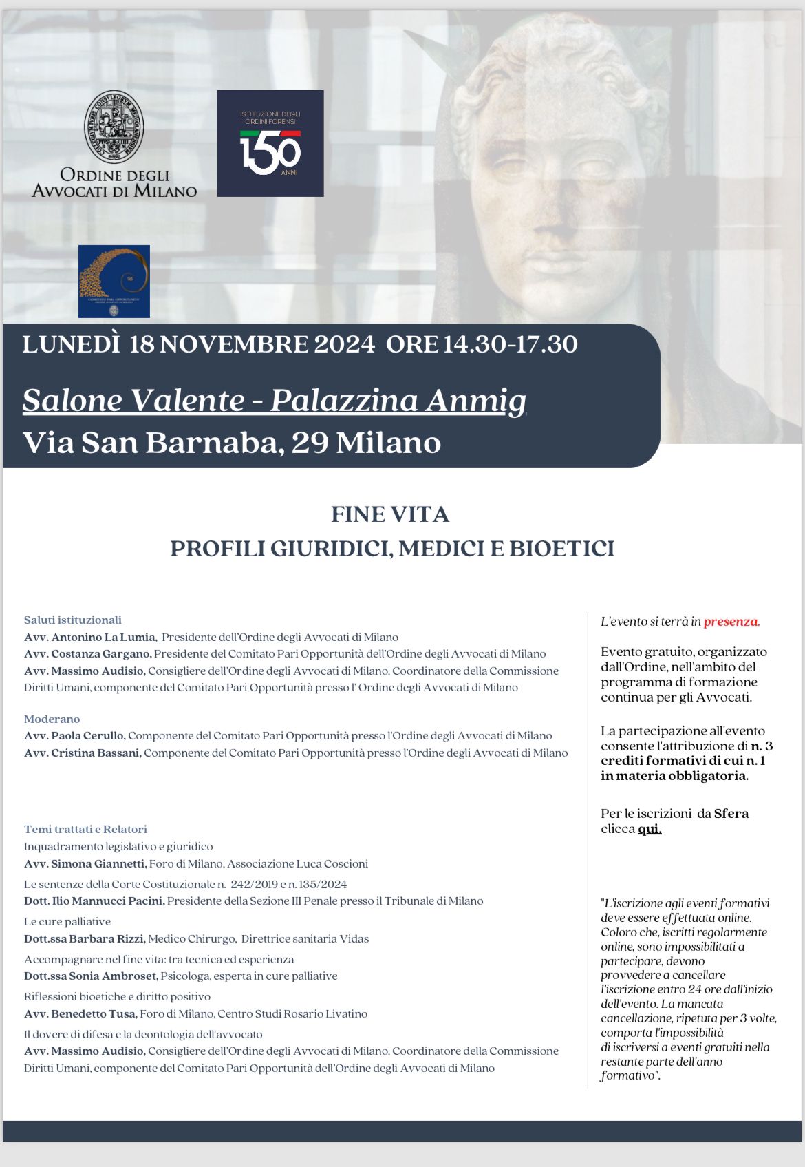 IL CPO dell’Ordine degli Avvocati di Milano organizza un evento gratuito nell’ambito della formazione continua per gli avvocati, sul tema del fine vita.
