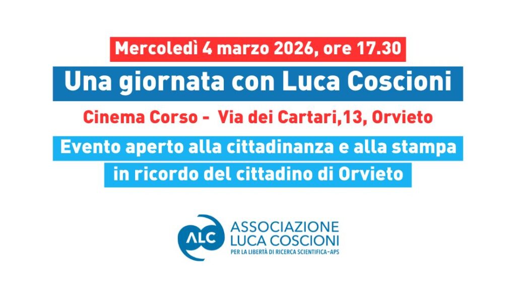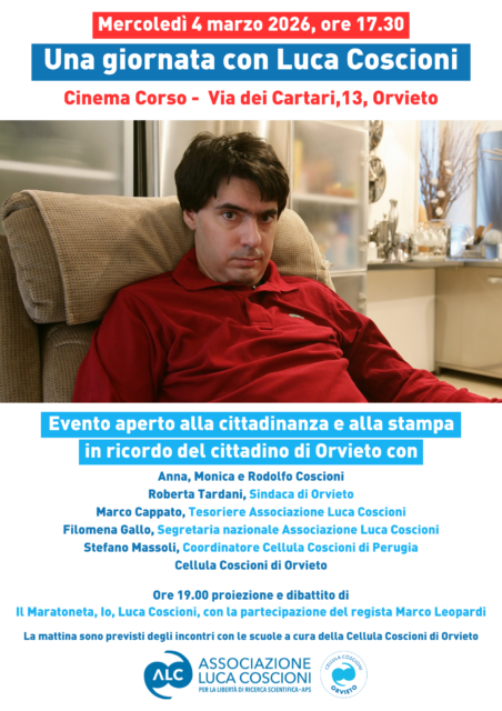 Mercoledì 4 marzo 2026, a partire dalle ore 17.30, il Cinema Corso di Orvieto ospiterà “Una giornata con Luca Coscioni”, un’iniziativa aperta alla cittadinanza e alla stampa per ricordare la figura di Luca Coscioni, cittadino di Orvieto, e rinnovarne l’impegno per la libertà di ricerca scientifica e i diritti civili