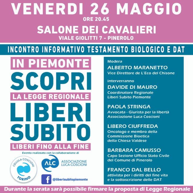 A Pinerolo, la Cellula Coscioni di Torino e Il comitato Liberi Subito Piemonte organizzano un incontro informativo sulle DAT, più comunemente conosciute come testamento biologico.