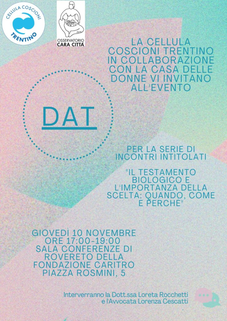 La Cellula Coscioni Trentino in collaborazione con la Casa delle Donne organizza l’iniziativa Il testamento biologico e l’importanza della scelta: quando, come e perchè