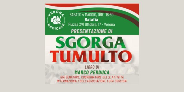 A Verona, Marco Perduca, già Senatore, coordinatore delle attività internazionali dell’Associazione Luca Coscioni e membro di Giunta, presenterà il suo ultimo libro SGORGA TUMULTO – finzione, funzione e fazione politica.