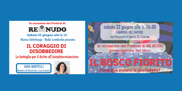 alle ore 16 l’incontro Come può aiutarci la psichedelia? con le co-autrici del libro Il bosco fiorito Letizia Renzini e Tania Re (consigliera Generale di ALC). Presenta Luca Pollini di Re Nudo.