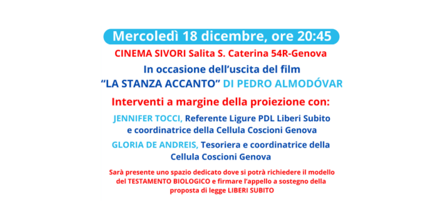 Jennifer Tocci, referente Liberi Subito Liguria,  e Gloria de Andreis, coordinatrice della Cellula Genova, faranno un intervento sul tema del fine vita prima della proiezione del film La Stanza Accanto di Pedro Almòdovar.