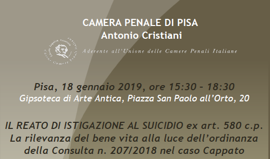 Sono previsti gli indirizzi di saluto di: Laura Antonelli, avvocato e presidente della Camera penale di Pisa; Alessandro Niccoli, avvocato e responsabile della formazione della Camera penale di Pisa.