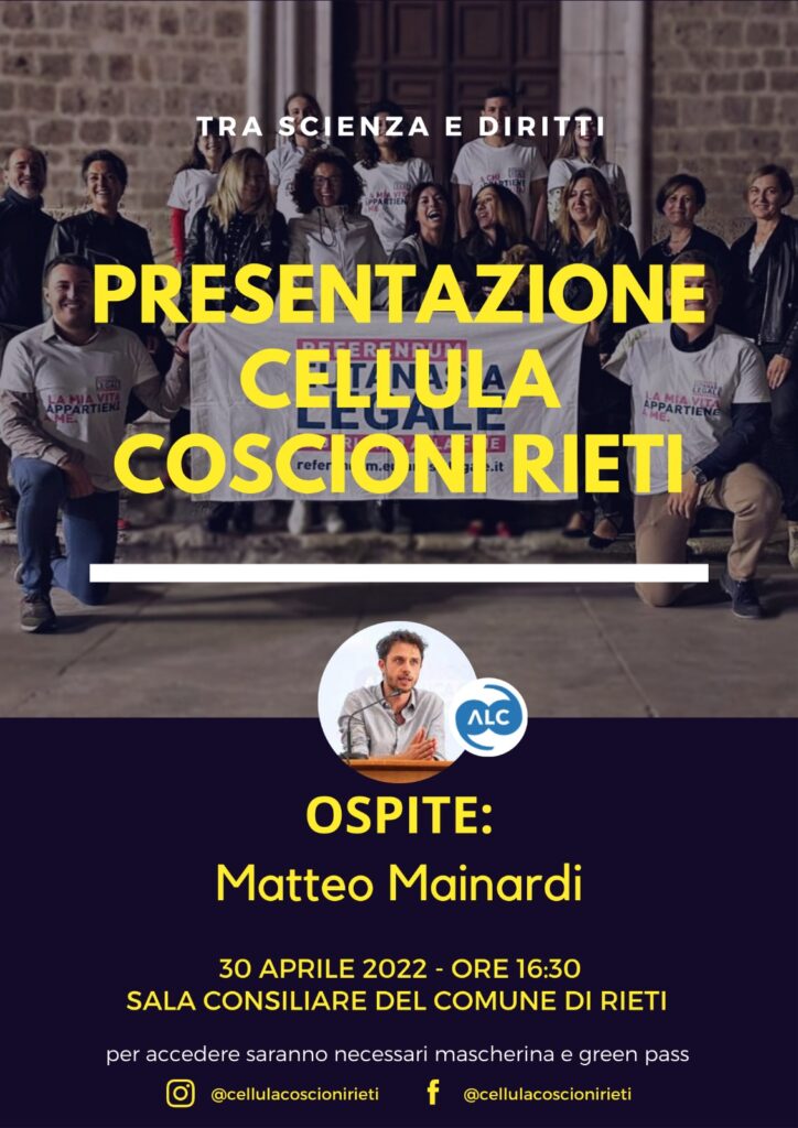 Sabato 30 aprile 2022, alle ore 16:30, presso la Sala consiliare del Comune di Rieti si costituisce la Cellula Coscioni di Rieti.