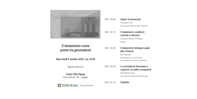 L’iniziativa è promossa con il contributo di Fideuram ed è pensata come un’occasione di dialogo a più voci sul valore del testamento in tutte le sue forme: come eredità, come espressione di volontà e come strumento di autodeterminazione.
