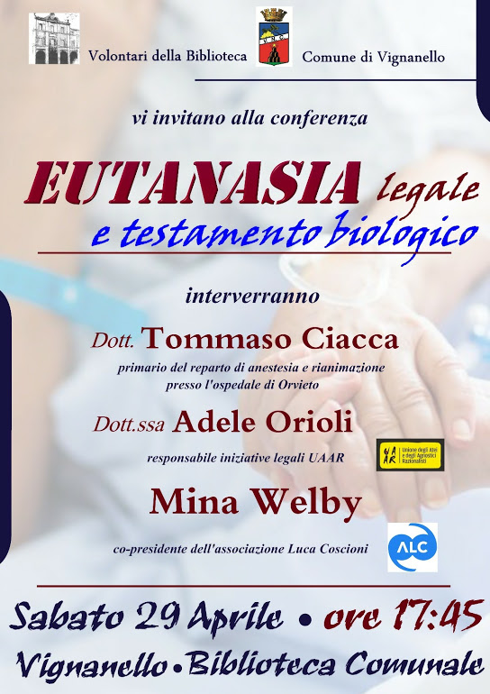 I Volontari della Biblioteca Comunale e il Comune di Vignanello organizzano la conferenza “Eutanasia Legale e Testamento Biologico” il giorno 29 aprile 2017, alle ore 17.45.