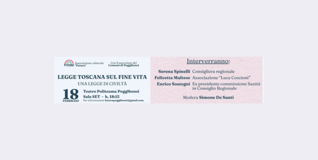 Felicetta Maltese, Coordinatrice della Cellula Coscioni di Firenze, parteciperà all’incontro pubblico “Riflessioni sul fine vita – Etica, diritto e autodeterminazione”, l’evento sarà un’occasione per approfondire la situazione normativa attuale e avere una visione completa sotto diversi punti di vista.