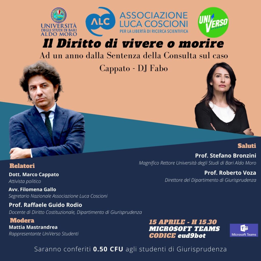 La Segretario dell’Associazione Luca Coscioni, Filomena Gallo, ed il Tesoriere dell’Associazione Luca Coscioni, Marco Cappato, parteciperanno al webinar Il diritto di vivere o morire. Ad un anno dalla sentenza del caso Cappato, organizzato dall’Università degli Studi di Bari “Aldo Moro” e dall’Associazione studentesca “Universo”.