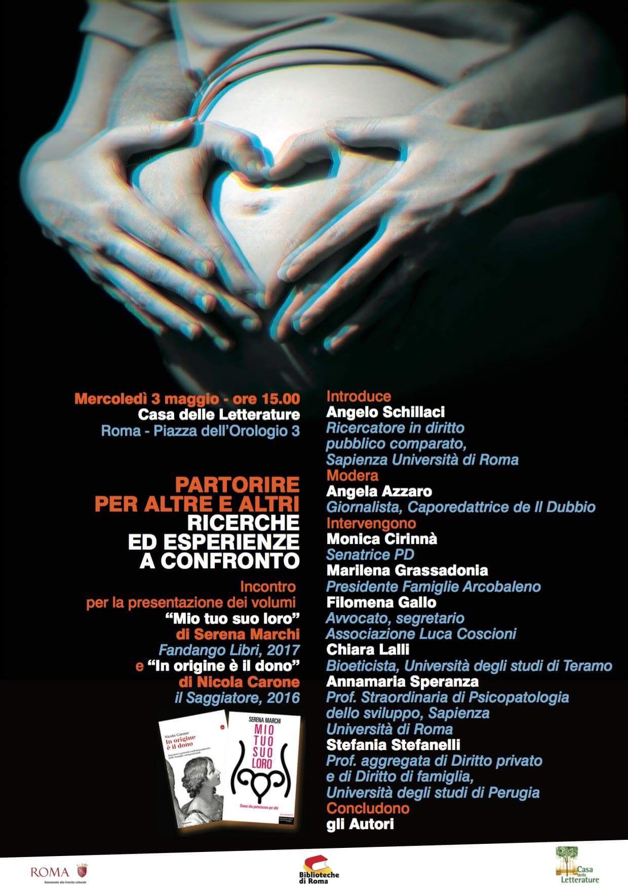 Mercoledì 3 Maggio, presso la Casa delle Letterature a Roma, l’Avvocato Filomena Gallo, Segretario dell’Associazione Luca Coscioni, parteciperà ad un dibattito sulla Gestazione per Altri dal titolo “PARTORIRE PER ALTRE E ALTRI – RICERCHE ED ESPERIENZE A CONFRONTO“, che vedrà la presentazione dei volumi “Mio, tuo, suo, loro” di Serena Marchi e “In origine è il dono” di Nicola Carone.
