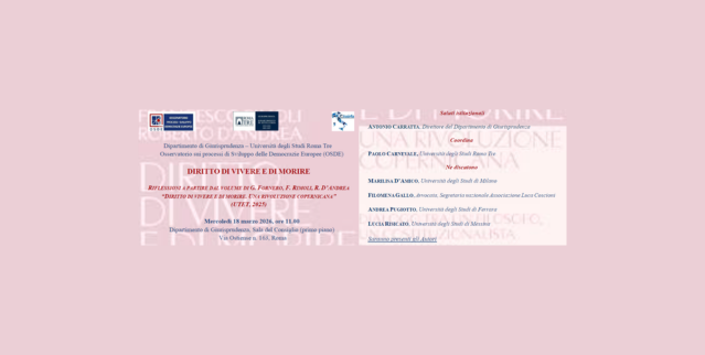 L’incontro nasce a partire dal volume di G. Fornero, F. Rimoli e R. D’Andrea, “Diritto di vivere e di morire. Una rivoluzione copernicana” (UTET, 2025), e rappresenta un’importante occasione di confronto accademico e giuridico sui temi dell’autodeterminazione, del fine vita e dell’evoluzione del diritto costituzionale in materia di libertà personali. Dopo i saluti istituzionali del Direttore del Dipartimento, Antonio Carratta, i lavori saranno coordinati da Paolo Carnevale (Università Roma Tre). Interverranno inoltre: