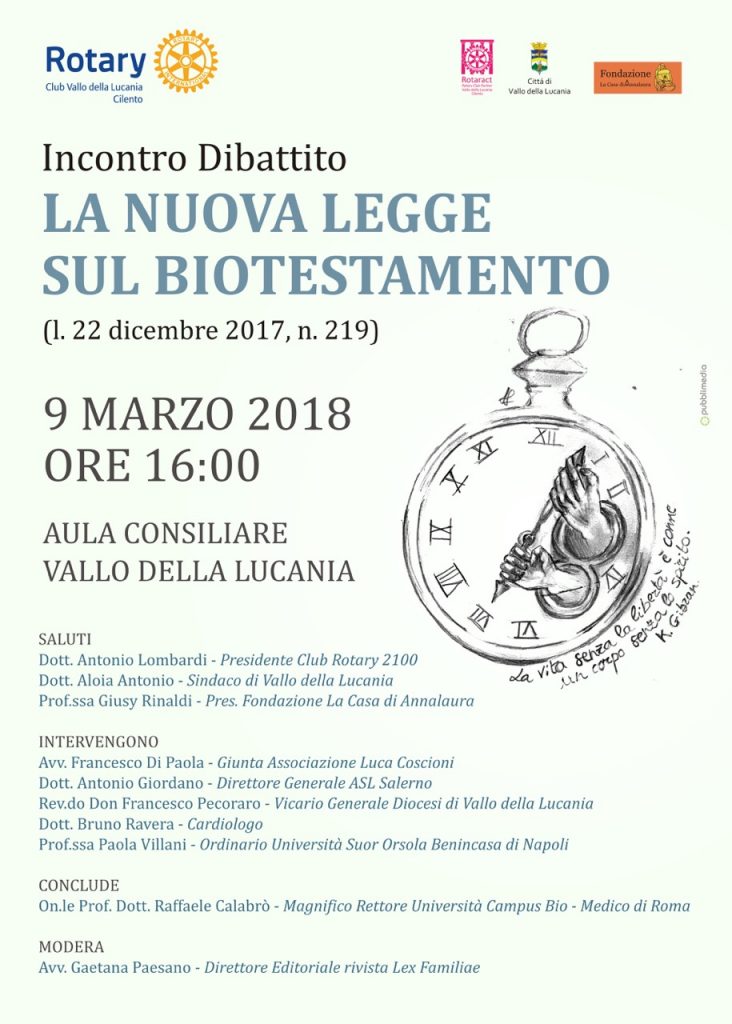 L’avvocato Francesco Di Paola, membro di giunta dell’Associazione Luca Coscioni, parteciperà all’incontro dibattito “La nuova legge sul Biotestamento” organizzato dal Rotary Club di Vallo della Lucania (provincia di Salerno).