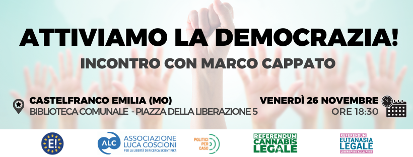 Il Tesoriere dell’Associazione Luca Coscioni, Marco Cappato, è a Castelfranco Emilia, in provincia di Modena, per partecipare all’incontro Attiviamo la Democrazia, organizzato dall’Associazione Luca Coscioni con Eumans, Politici per Caso e i comitati referendari Cannabis Legale ed Eutanasia Legale.