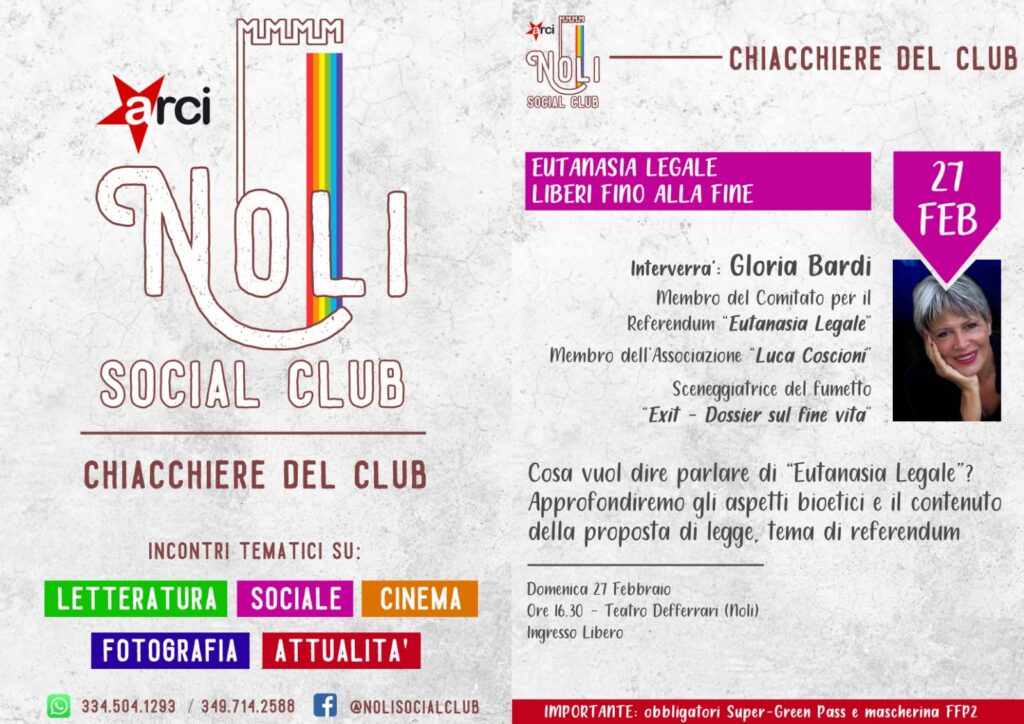 Gloria Bardi, iscritta dell’Associazione Luca Coscioni e sceneggiatrice del fumetto Exit – Dossier sul Fine vita, partecipa all’incontro Cosa vuol dire parlare di Eutanasia Legale? organizzato dall’ARCI Noli social club.
