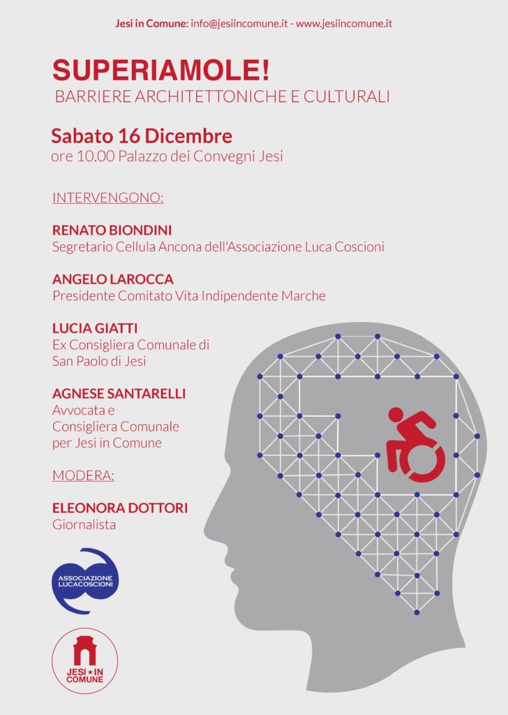 L’evento si terrà sabato 16 dicembre 2017 alle ore 10:00 al Palazzo dei Convegni di Jesi, in provincia di Ancona. Oltre a Biondini, interverranno anche Angelo Larocca, presidente del Comitato Vita Indipendente Marche, Lucia Giatti, ex consigliere comunale di San Paolo di Jesi (AN) e Agnese Saltarelli, avvocato e consigliere comunale della lista Jesi in Comune. Modera l’incontro, la giornalista Eleonora Dottori.