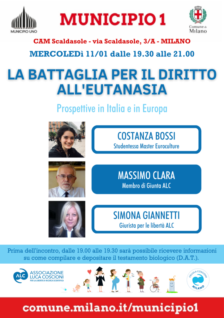 Mercoledì 11 gennaio alle ore 19.30 presso CAM Scaldasole, via Scaldasole 3/a l’Associazione Luca Coscioni – Cellula di Milano organizza l’incontro: “LA BATTAGLIA PER IL DIRITTO ALL’EUTANASIA – Prospettive in Italia ed in Europa”