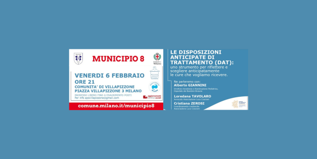 In occasione di un incontro promosso dal Municipio 8 di Milano e dalla Comunità di Villapizzone, con la collaborazione della Cellula Coscioni di Milano, si parlerà delle Disposizioni Anticipate di Trattamento (DAT): uno strumento  che consente a ogni persona di esprimere in anticipo la propria volontà sulle cure mediche che desidera – o non desidera – ricevere nel caso in cui, in futuro, non fosse più in grado di comunicarla.