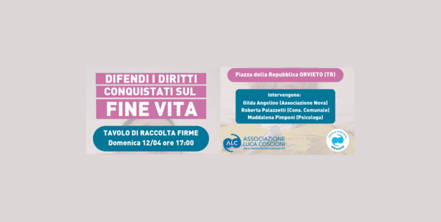 La Cellula Coscioni di Orvieto, in occasione della mobilitazione nazionale sul fine vita, organizza un tavolo di raccolta firme e di approfondimento. L’iniziativa infatti sarà arricchita da un momento di confronto pubblico a cui interverranno: