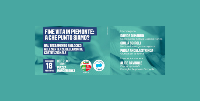 Interverranno: Davide Di Mauro, Coordinatore Cellula Coscioni Torino, Giulia Sbiroli, medico di emergenza-urgenza, Paola Angela Stringa, Giurista per le libertà, Cellula Coscioni Torino. Introdurrà e modererà: Alice Ravinale, capogruppo AVS in Consiglio Regionale Piemonte
